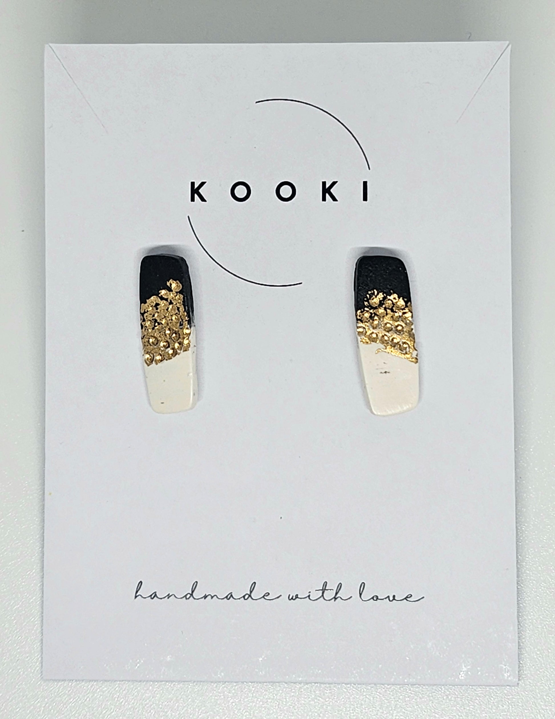 These earrings are modern and captivating. Their design features a beautiful blend of two distinct parts—a smooth colored top and a creamy white bottom with sparkling gold glitter. These handmade earrings are lightweight and will add a touch of sparkle and sophistication to your outfit.