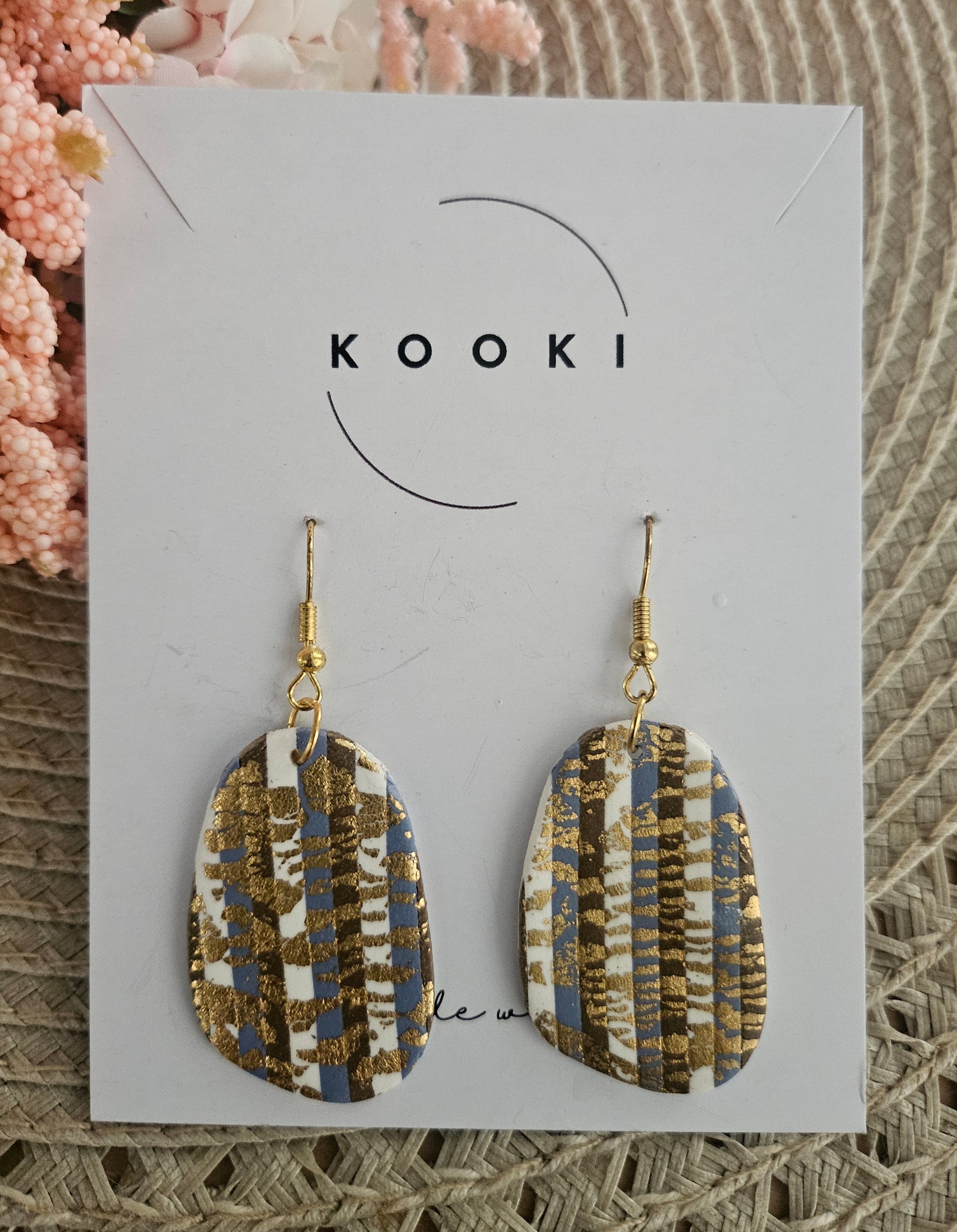These earrings have specks on a light blue and brown background. The design is very lightweight and stylish, adding a unique and playful touch to your look.