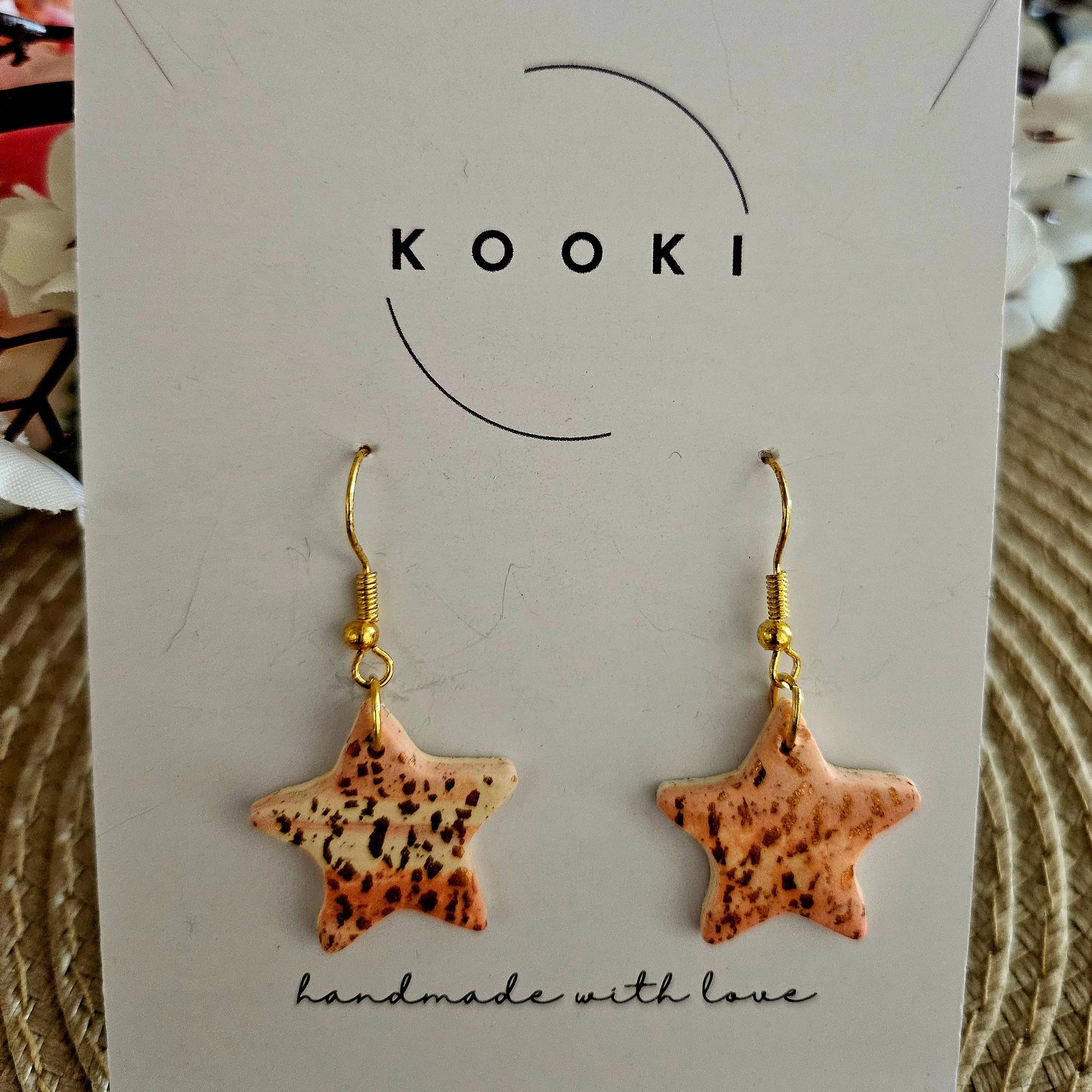 These star-shaped earrings are very sweet and eye-catching. They have tiny gold specks on a light peach background, giving them a shimmery appearance that will add a fun and celestial vibe to your style.